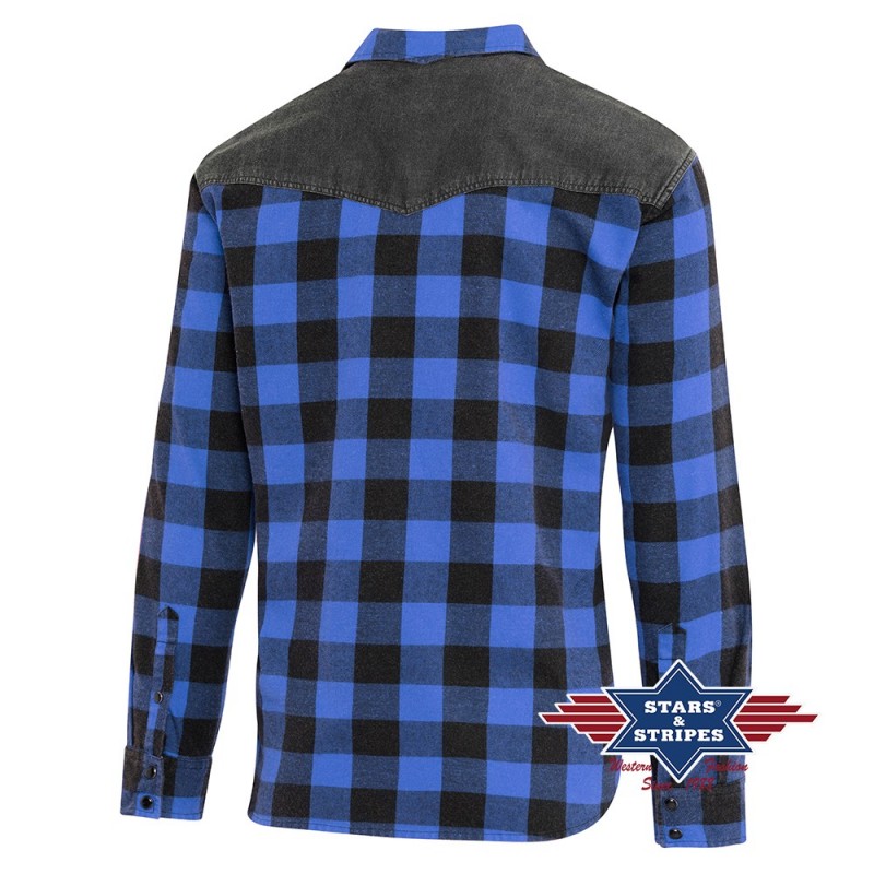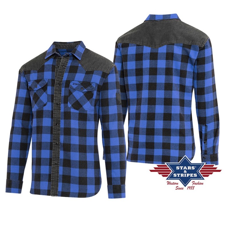 Casual, geruit westernoverhemd in stone-washed look met zwarte denim schouderbies en applicatie van esdoornblad. De opgestikte borstzakken met Stars & Stripes-merkletters en drukknopen ronden het shirt perfect af.